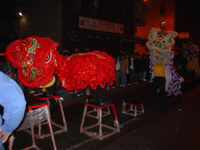I got there plenty early - not knowing how crowds would be or where the parade route would go. I had an intersection and a start time. I get there and there is absolutely nothing going on. No streets are blocked off, plenty of traffic, a few small groups of people hanging out here and there (including a handful of very caucasian college-aged males with "gatorade" bottles, acting very not sober and screaming out "happy new year!" every ten seconds.) I walked around. I did laps. I didn't want to look like a tool standing on the street waiting for something to happen. After some time I heard some kind of music going on, but it was several blocks away from the intersection listed for the parade - I gravitated toward the noise until I came upon a group of kids banging on some percussion instruments. Then more came out with some of those lion costumes you see in the news or on TV and started moving. But they were just carrying them down the sidewalk, single file. I followed. Other people were doing the same. They eventually arrived in front of a restaurant.