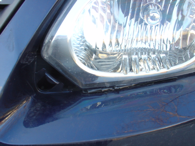 The headlight was perfectly fine but there is a little silver piece of plastic that got knocked out of the corner spot (compare to the normal one in the photo below). That piece in part helps keep the lights shining on the road together and in the same spot, so that one light was then pointing excessively downward; you can see the McGyver-job I did to prop it up (using electrical tape and a piece of foam padding from an old bicycle helmet of Tristan's). Frankly, I was pretty proud of myself that I did that without any monetary or mechanical assistance!