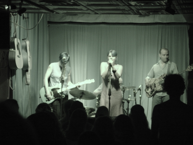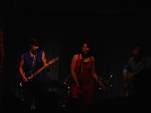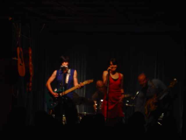 We tried to get there early, and we kinda did, but they had us waiting in line on the stairs up to the Tin Angel for a long-ass time. "Doors open at 8, show starts at 8:30 sharp!" Right. Add 30-40 minutes to both of those. Here's Jim & Amy, my concert cohorts, taken by surprise in the line.