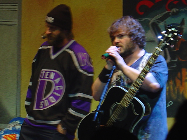 They actually played this silly video that explained how The D met up with the guys in the band. That's Lucifer on lead guitar, Colonel Sanders on drums and Charlie Chaplin on bass. They all met in hell.