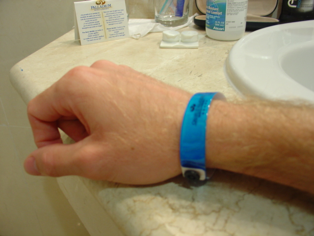 As soon as you check in, they strap this wristband on you. Everybody who stays at this complex gets one (there are several hotels and restaurants on the "grounds" and you need it to use all the facilities that they share). Kind of annoying, but it's a lovely shade of blue. Taken in our spacious hotel bathroom.