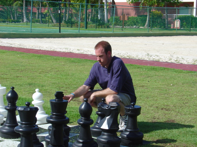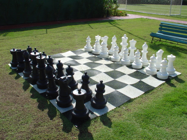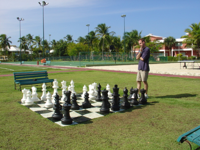 Back at the sports complex, they had this HUGE chess set... there was one at the pool, too but it was missing a pawn (filled in by a large orange street cone). At that very instance (for the first and last time) I was disappointed Steph didn't play. But I had to pretend. Steph rolled her eyes but took the pictures, anyway. What a good wife.