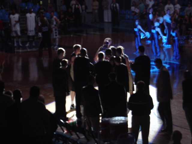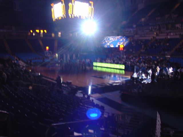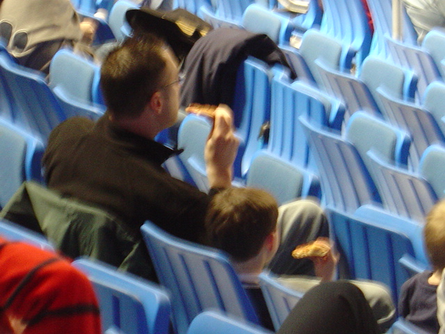 OK, so the cheerleaders took all the pizza boxes around the crowd during a timeout and handed them out to whomever they thought was deserving of free food. And yes, the pizza was real (I thought maybe it was just a box with a coupon for a free one inside) - this kid scored one and shared with his dad. Couldn't have been too fresh!