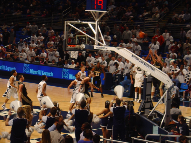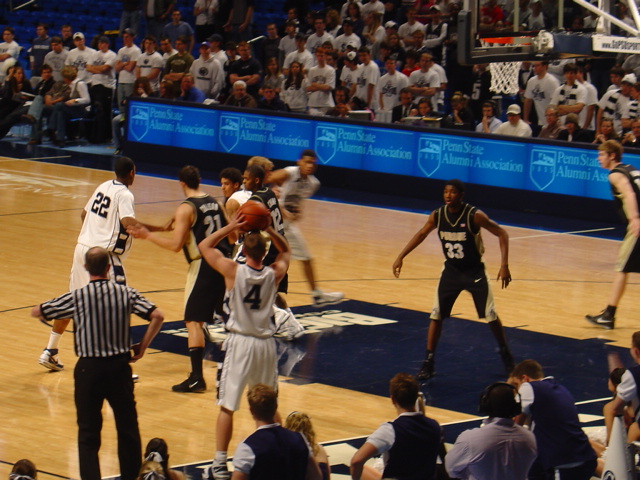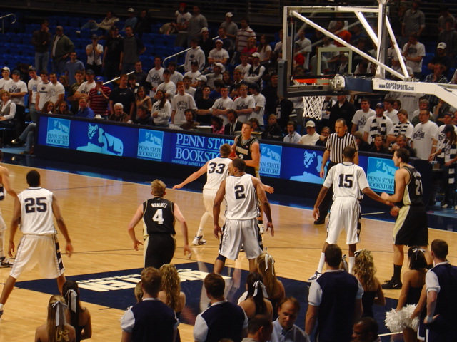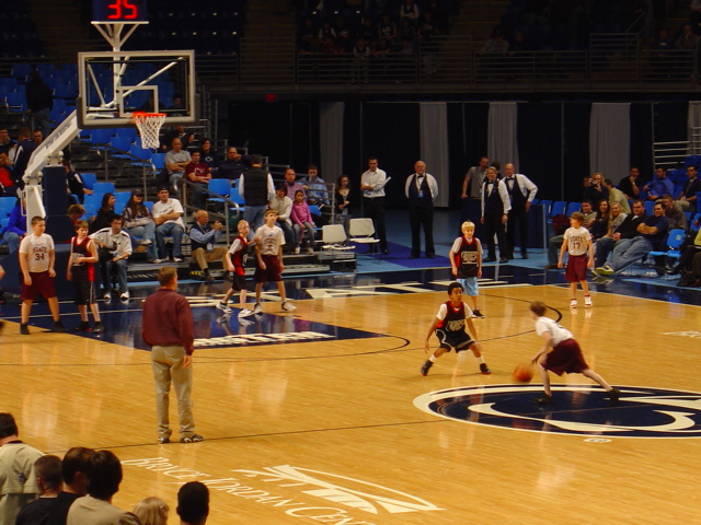 Pre-game warm-ups! Nemanja Calasan with the lay-up. The Nittany Lion is bewildered.
