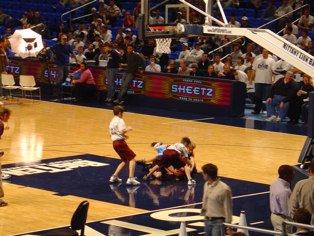 PSU Cheerleaders and the PSU Dance Team, the Lionettes (shouldn't that be the Lionesses?), converge at center court... to welcome the Boilermakers!