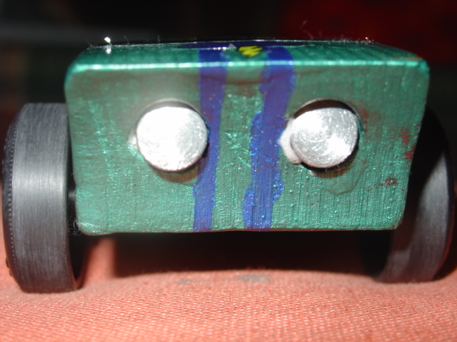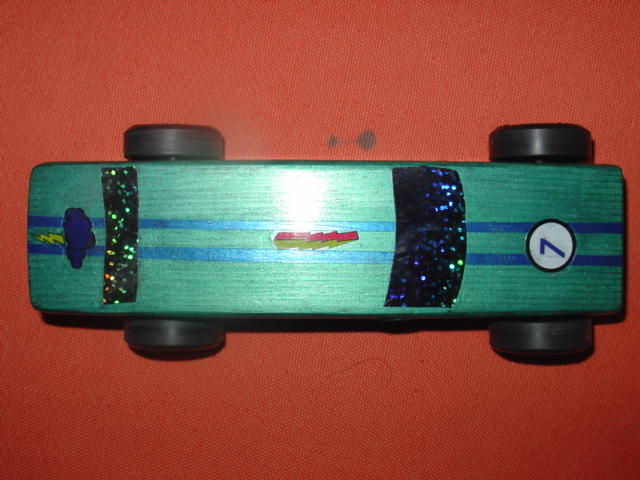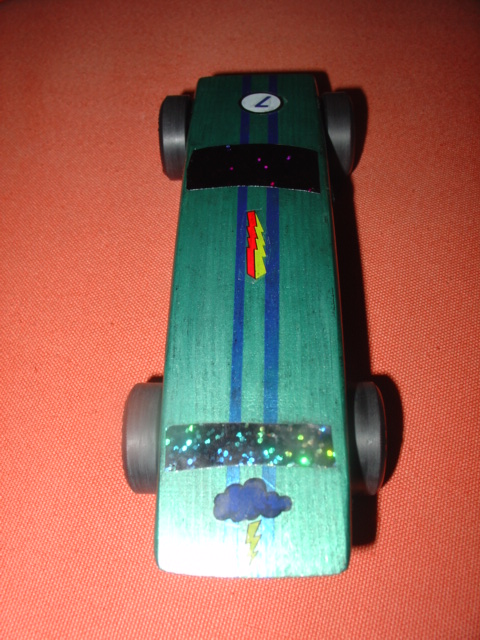 1345 hrs. Second heat. Lane 2. It's neck and neck. All three cars are within 1/2 length of each other. He loses by a hair. We notch 1 point on the board for 2nd place. Bummed but not down and out. I think lane 2 is the evil lane. Must be built up with excessive rubber from worn down tires. Except that the tires on these cars are plastic. Hmmm.